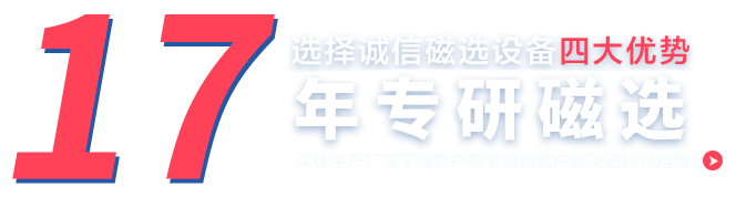誠(chéng)信機(jī)械主要生產(chǎn)研發(fā)和銷售水選磁選機(jī)系列、干式磁選機(jī)系列、強(qiáng)磁磁選機(jī)系列、除鐵磁選機(jī)系列、渦電流分選機(jī)系列等其他系列
